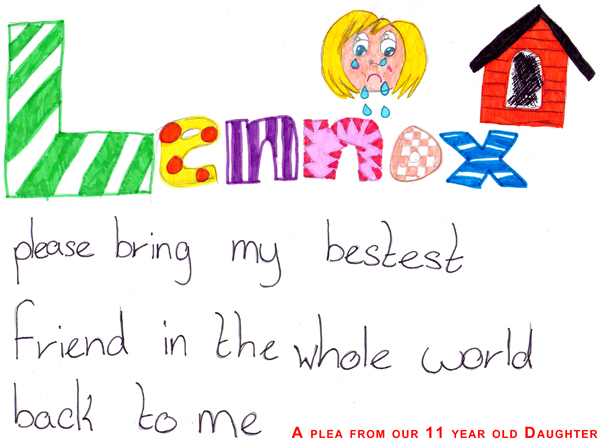 Local leading MP’s including Northern Ireland’s First Minister joined in support of Lennox stating in the Belfast Telegraph and other media they were “Appalled” by the seizure and treatment of Lennox and his family. A global campaign which boasts millions of supporters and several hundred thousand petition signatures had begun in support of Lennox’s freedom. The ADBA Inc, various Animal Rights groups, Animal Welfare organisations, Veterinarians, Dog Breed Behaviorist Experts and many celebrities had all gave their support for Lennox’s freedom and many supporters who are regular tourists to Northern Ireland have went further by stating they will not return to Northern Ireland due to Lennox’s cruel unnecessary death at the hand’s of Belfast City Council and their contracted kennel. The most heartfelt plea of all was heard from Brooke, the owner’s Daughter who is registered disabled. Lennox grew up around Brooke and the two became inseparable. Due to Brooke’s illness she is unable to play each day with other children and so found Lennox to always be there as a playmate and someone to be of comfort to her. Since her best friend was taken Brooke has missed much School due to suffering health and unneeded stress caused by missing her dog. Brooke’s specialist Doctor at Belfast Royal Hospital for Sick Children has also expressed growing concern for the child’s separation from her pet.