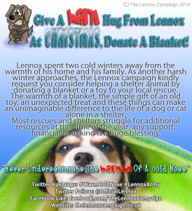 Got an old blanket or jumper? donate it to an animal shelter this winter in Lennox’s name and help keep a dog or cat warm and comfortable. Take just one day out of your hectic Christmas schedule this year and have a look through old bed linen, blankets, clothing (without buttons or zips) and take them to a local animal shelter, you could even make a family day of it and maybe meet your next family pet!